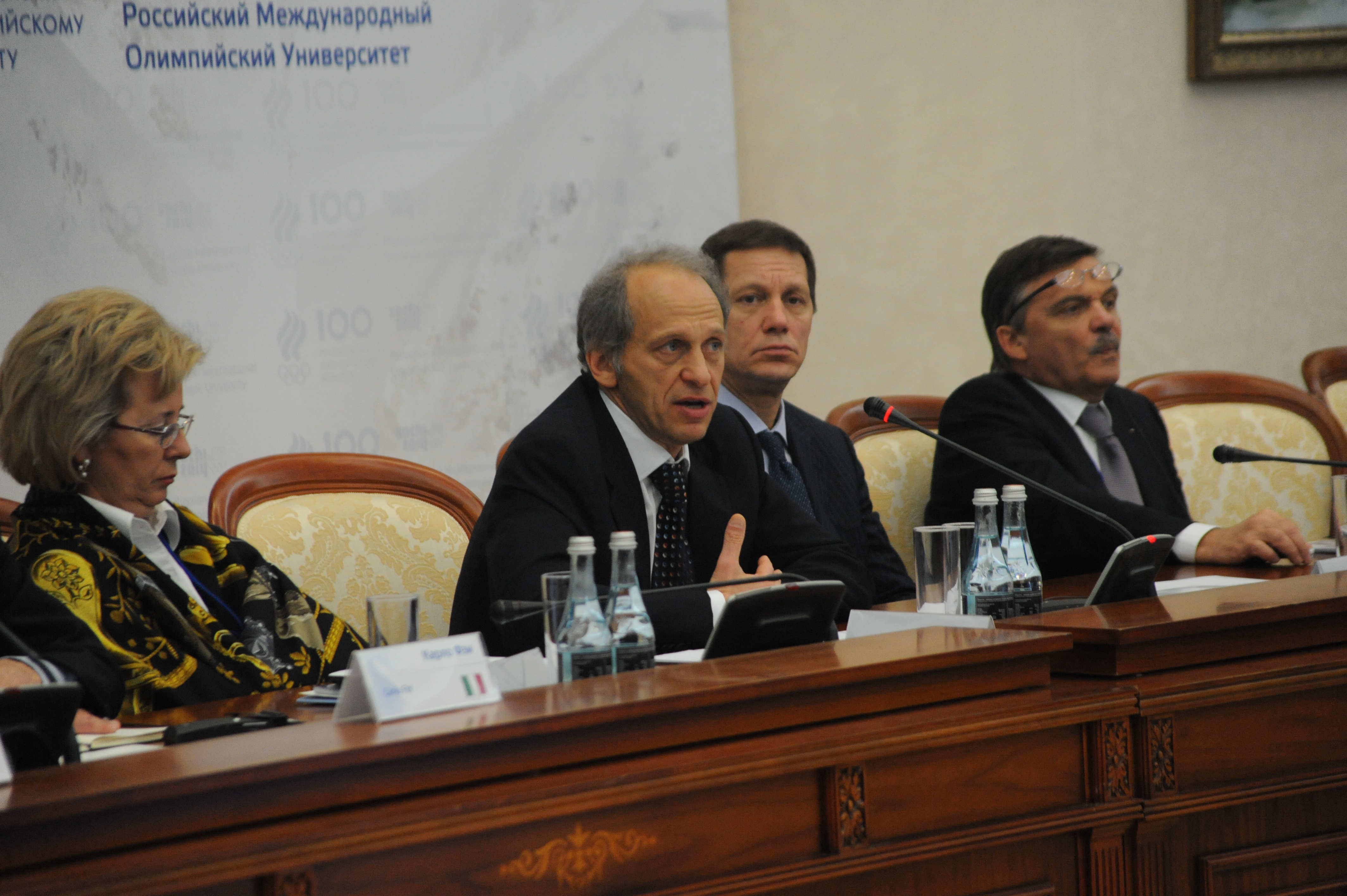 - 7. Генеральный директор РМОУ профессор Лев Белоусов выступает с докладом «Настоящее и будущее Олимпийского Университета» перед участниками семинара. На снимке (слева направо): статс-секретарь-заместитель министра спорта, туризма и молодежной политики РФ Наталья Паршикова, Лев Белоусов, Президент Олимпийского комитета России, заместитель Председателя Правительства РФ, заместитель Председателя Попечительского совета РМОУ Александр Жуков, глава Международной федерации хоккея с шайбой Рене Фазель.