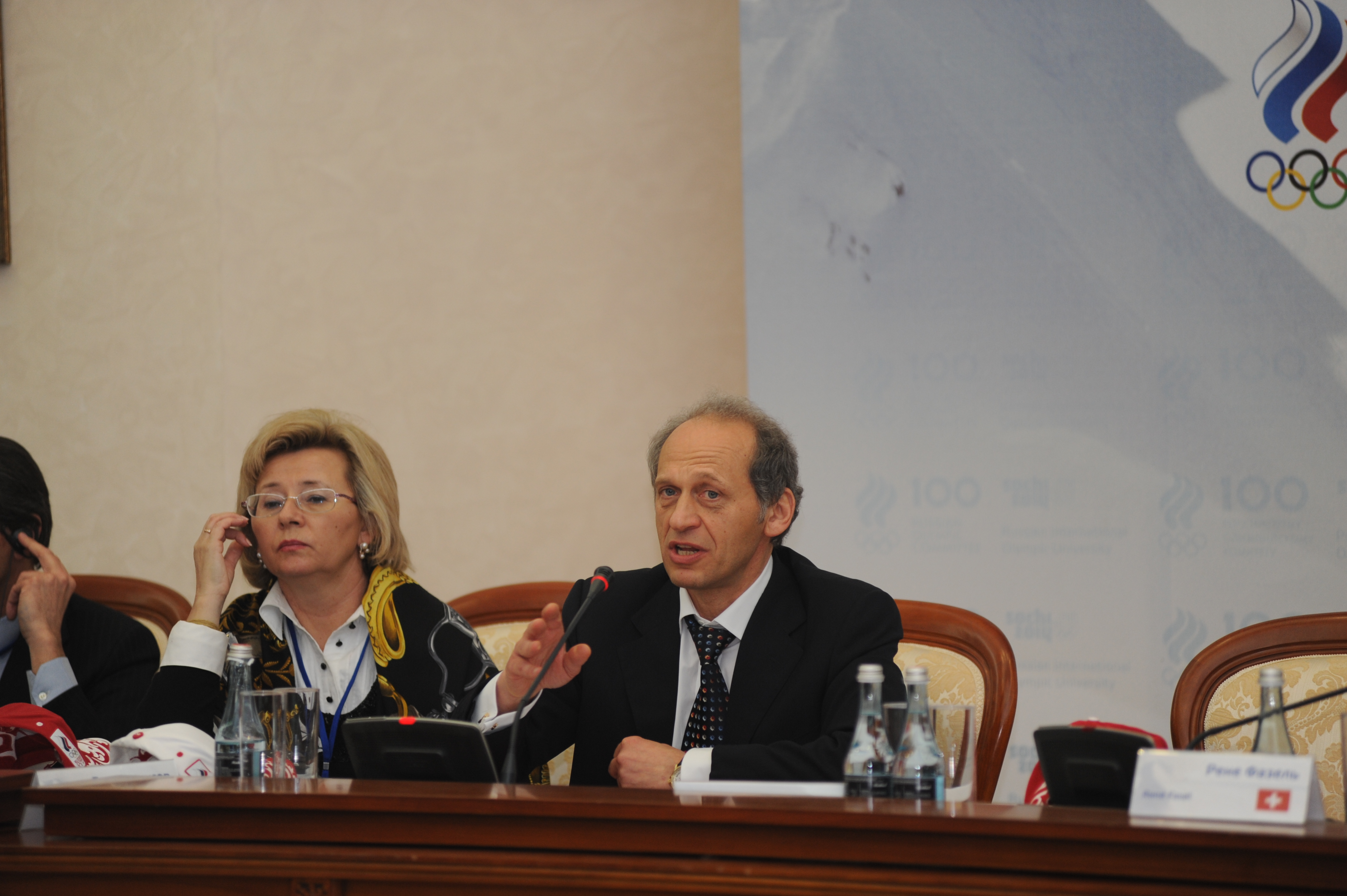 - 7. Генеральный директор РМОУ профессор Лев Белоусов выступает с докладом «Настоящее и будущее Олимпийского Университета» перед участниками семинара. На снимке (слева направо): статс-секретарь-заместитель министра спорта, туризма и молодежной политики РФ Наталья Паршикова, Лев Белоусов, Президент Олимпийского комитета России, заместитель Председателя Правительства РФ, заместитель Председателя Попечительского совета РМОУ Александр Жуков, глава Международной федерации хоккея с шайбой Рене Фазель.